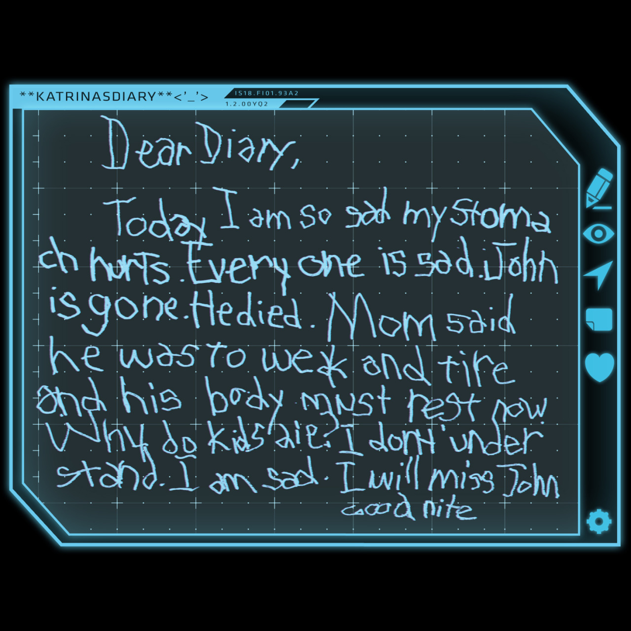 Hoje eu estou tão triste, meu estômago doi. Todo mundo está triste. John se foi. Ele morreu. Mamãe disse que ele estava muito fraco e cansado (escrito errado) e seu corpo precisa descansar agora. Por que crianças morrem? Eu não entendo. Eu estou triste. E vou sentir falta de John.