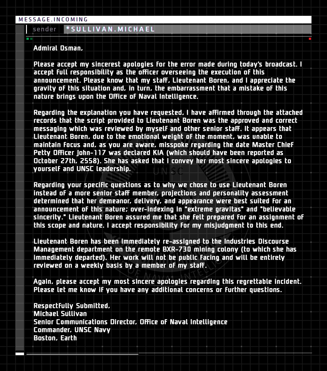 Em relação a explicação que você solicitou, afirmo que pelos registros anexados no script fornecido ao tenente Borem foi aprovado a mensagem correta que foi comentado por mim e por outros altos funcionários, parece que o Tenente Borem, devido ao peso emocional no momento, foi incapaz de manter o foco e, como você sabe, expressei mal em relação a data, Master Chief, Petty Officer John-117 foi declarado KIA ( que deveria ter sido relatado como 27 de outubro de 2558). Ela pediu que eu o transmitisse as mais sinceras desculpas a liderança da UNSC.