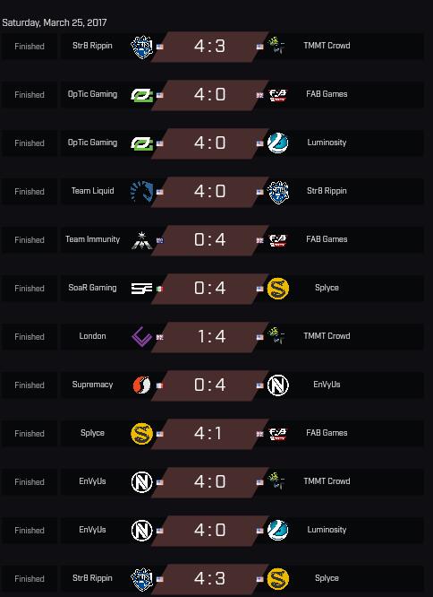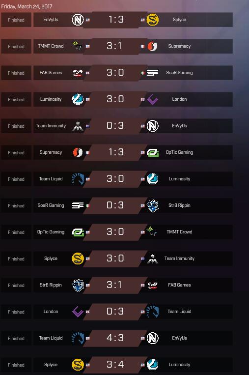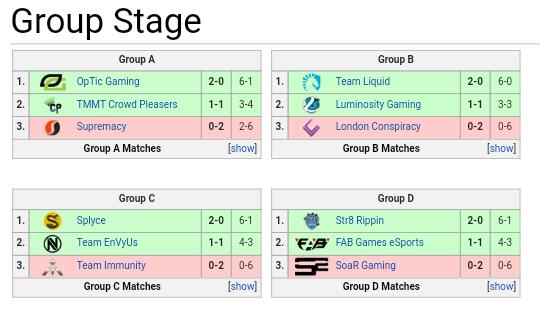 Optic Gaming classificou-se em primeiro, seguida por Crowd Pleasers em segundo lugar e a Supremacy em terceiro.