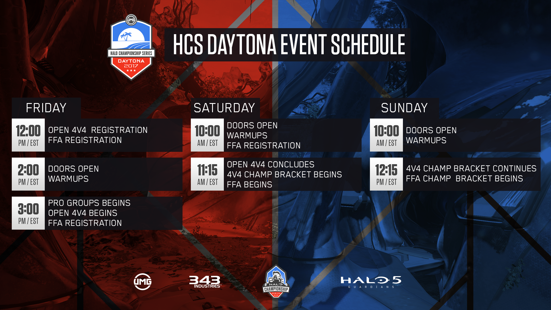 A HCS Daytona se extenderá ao longo de 3 dias. No primeiro, haverá apenas as primeiras partidas do torneio de 4v4 e as inscrições do torneio de FFA. Ao segundo, teremos o início das partidas de FFA e o início da chave dos vencedores no torneio 4v4. No terceiro, haverá o início da chave dos vencedores no torneio de FFA e a continuação da chave dos vencedores no torneio 4v4.