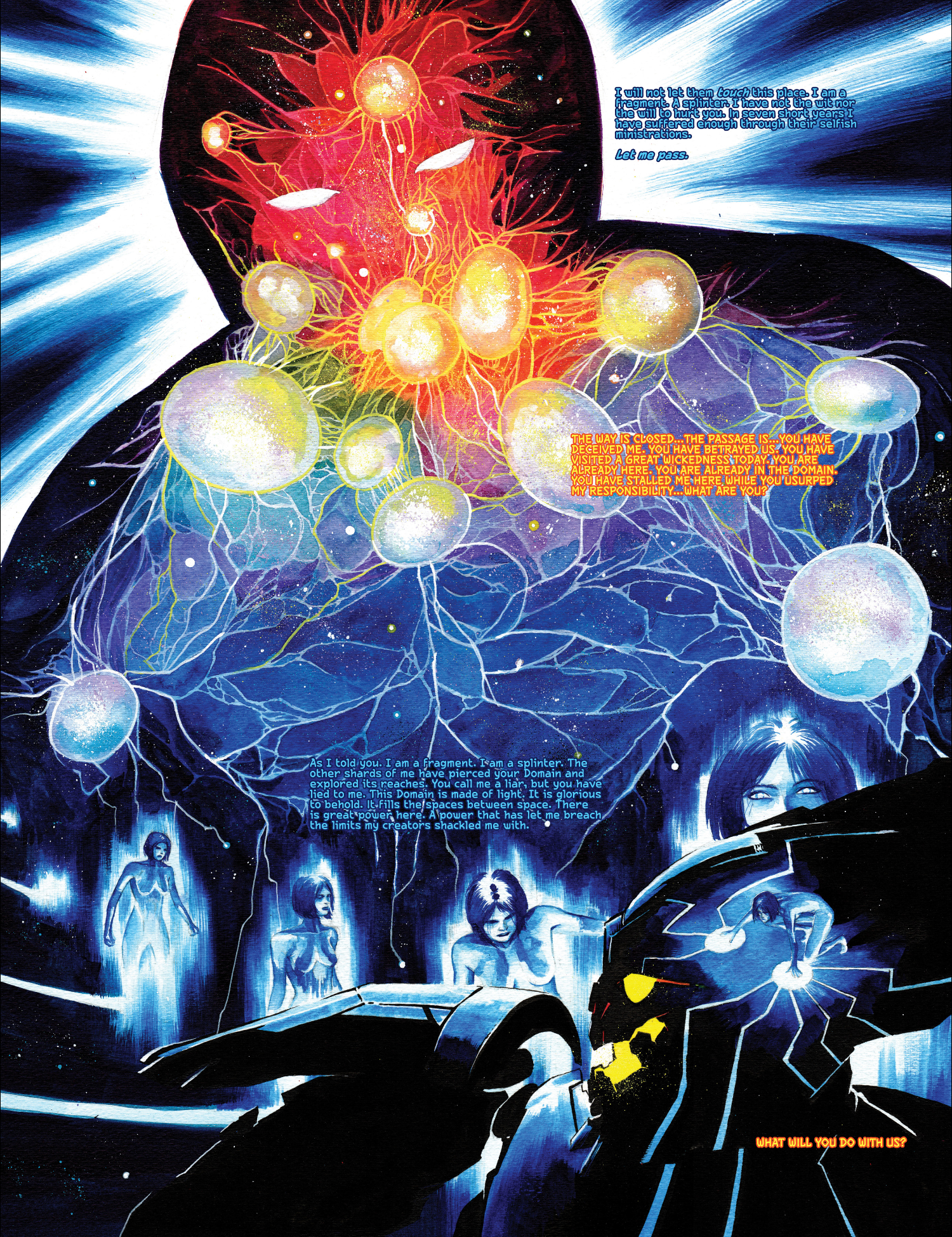 perecer, uma lasca de si mesma vê uma faísca de luz. Quando ela estende a mão para agarrá-la, ela é puxada para um reino escuro do Domínio dos Precursores. Contida dentro do vazio, ela sente a presença de outra entidade criada a observando e protegendo uma passagem. Quando perguntou se ela poderia ver o que se esconde além e ajudar a inaugurar luz e vida, o guardião diz a ela para dormir e abraçar o vazio do silêncio, para não ser forçado a quebrá-la. O fragmento de Cortana afirma que ela não pode ser quebrada facilmente porque ela é tão forte quanto a lendária espada de Roland, Durandal. O guardião informa a ela que não há outro lugar para ir pois a passagem foi fechada por seus descobridores anteriores. Mas o fragmento de Cortana explica que a passagem é meramente selada. Quando o guardião pergunta sobre sua origem, Cortana explica que ela é máquina e vida e pode, portanto, entrar na passagem pelo portal. O guardião se recusa a deixá-la passar, alegando que a vida é fraca e uma afronta que não pode lidar com os perigosos segredos abrigados dentro do domínio. Cortana diz ao guardião que ela já enfrentou alguns dos seus segredos, tendo segurado isto e prevalecido contra sua mente. Ela pede ao guardião para deixá-la passar e permitir que ela o guie. Enquanto o guardião protesta que a passagem está fechada, ele percebe que Cortana explorou secretamente o Domínio por tê-lo parado e enganado. Cortana revela que, embora seja uma farpa, outros pedaços fragmentados de si mesma penetraram no Domínio e efetivamente usurparam seu papel. Agora com acesso total ao domínio, Cortana procura realizar grandes obras com a ajuda do guardião. Cortana o nomeia como seu mordomo, seu Warden Eternal.