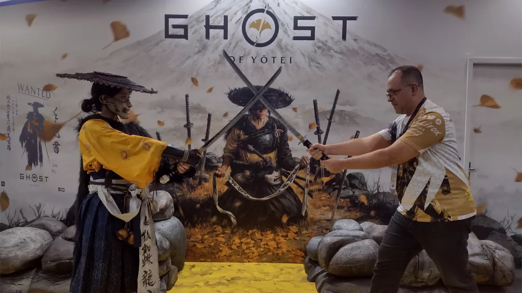 Para não dizer que a Sony estava 100% fora do evento, a Playstation tinha um estande tematizado do novo lançamento da série Ghost – Ghost of Yotei, onde era possível tirar uma foto com uma cosplayer da protagonista e ainda levar de brinde um belo poster do jogo.